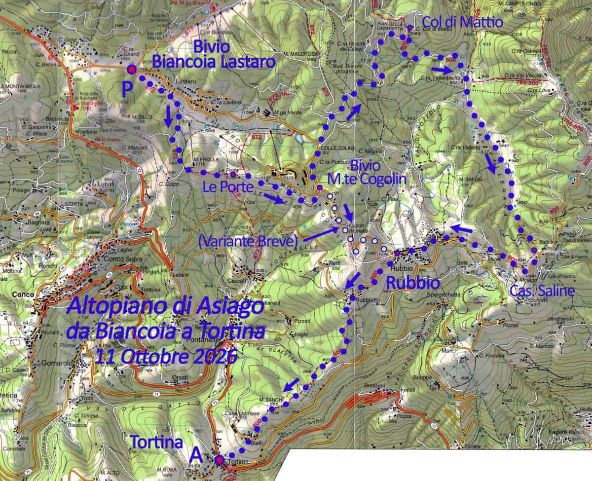 Bivio Biancoia/Lastaro (m 1064) – sent. 872 – Le Porte (m 1088) – bivio M.te Cogolin (m 1125) – q. 1148) – Col di Mattio (m 1083) – Cas. Saline (m 1030) – sent. 800 – Rubbio (m 1046) – Tortima (m 750). (ore 4/5 ca. – disl. + 200 m; – 500 m – E).