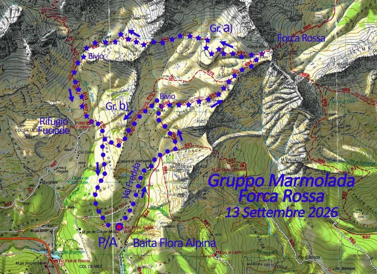 Baita Flora Alpina (m 1818) – Val Fredda – sent. 694 – bivio a q. 2088 poi: Gr. a) Passo Forca Rossa (m 2499) – sent. 693 – forc. q. 2211 – sent. 607 – Rif. Fuciade (m 1962) – Baita Flora Alpina. (ore 6 ca. – disl. +/- 850 m – EE)