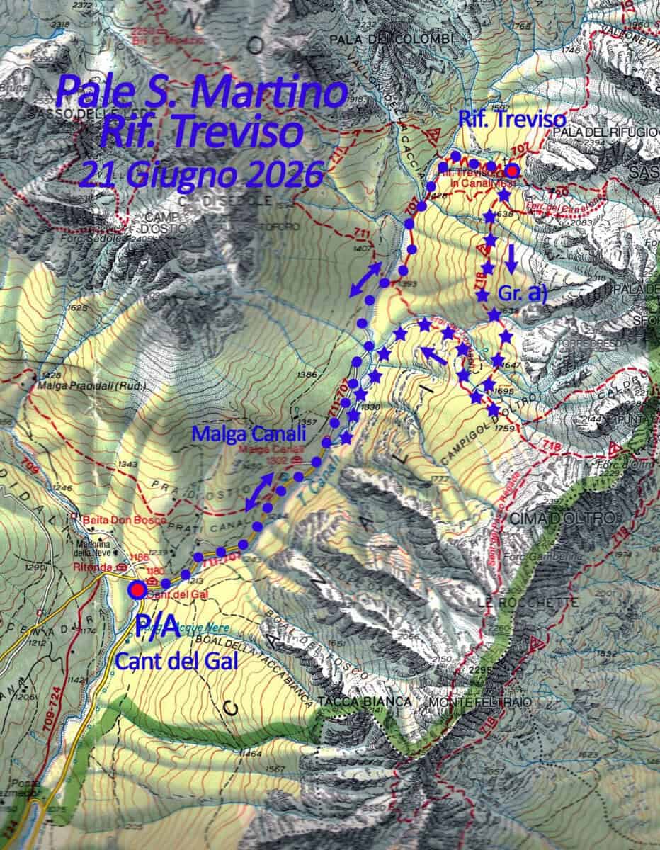 Gr. a); Cant del Gal (m 1180) – Malga Canali (m 1302) – Rif. Treviso (m 1631) – sent. 718 – Troi de i Todeschi – Cant del Gal. (ore 4/5 – disl. +/- 600 m – EE) Gr. b): Cant del Gal – Rif. Treviso e ritorno. (ore 4 ca. – disl. +/- 450 m – E)